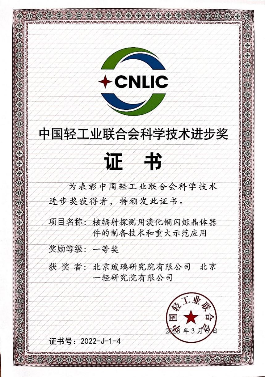 2023年4月11日,2022年度中国轻工业联合会科学技术奖颁奖典礼在厦门举行。玻璃院及一轻院联合申报的“核辐射探测用溴化镧闪烁晶体器件的制备技术和重大示范应用”,荣获2022年度中国轻工业联合会科学技术进步奖一等奖,该奖为省部级科学技术奖,具有推荐国家科学技术奖资格。